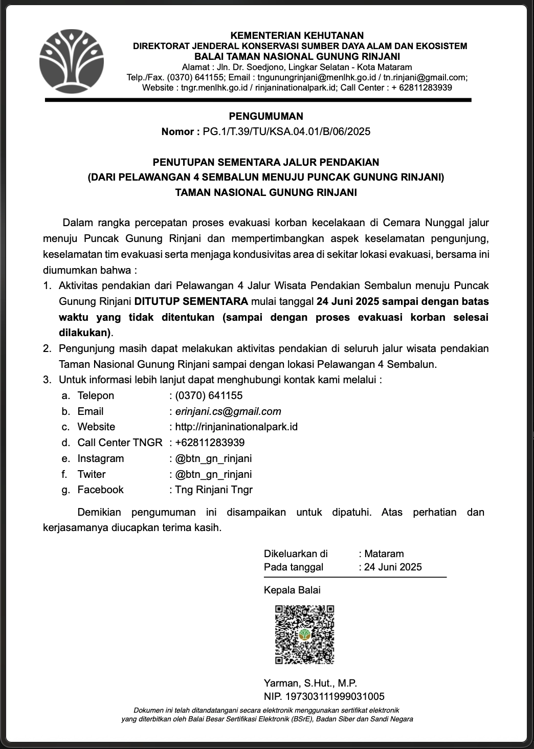 Par la lettre PG.1/T.39/TU/KSA.04.01/B/06/2015 du 24 juin 2025, le Parc National a indiqué que l'ascension de la voie Sembalun ne pouvait se faire que jusqu'au Pelawangan 4. Ainsi, les grimpeurs peuvent continuer à profiter du paysage du Pelawangan, du lac et du Senaru Pelawangan. Toutes les entrées d'ascension sont toujours ouvertes normalement.